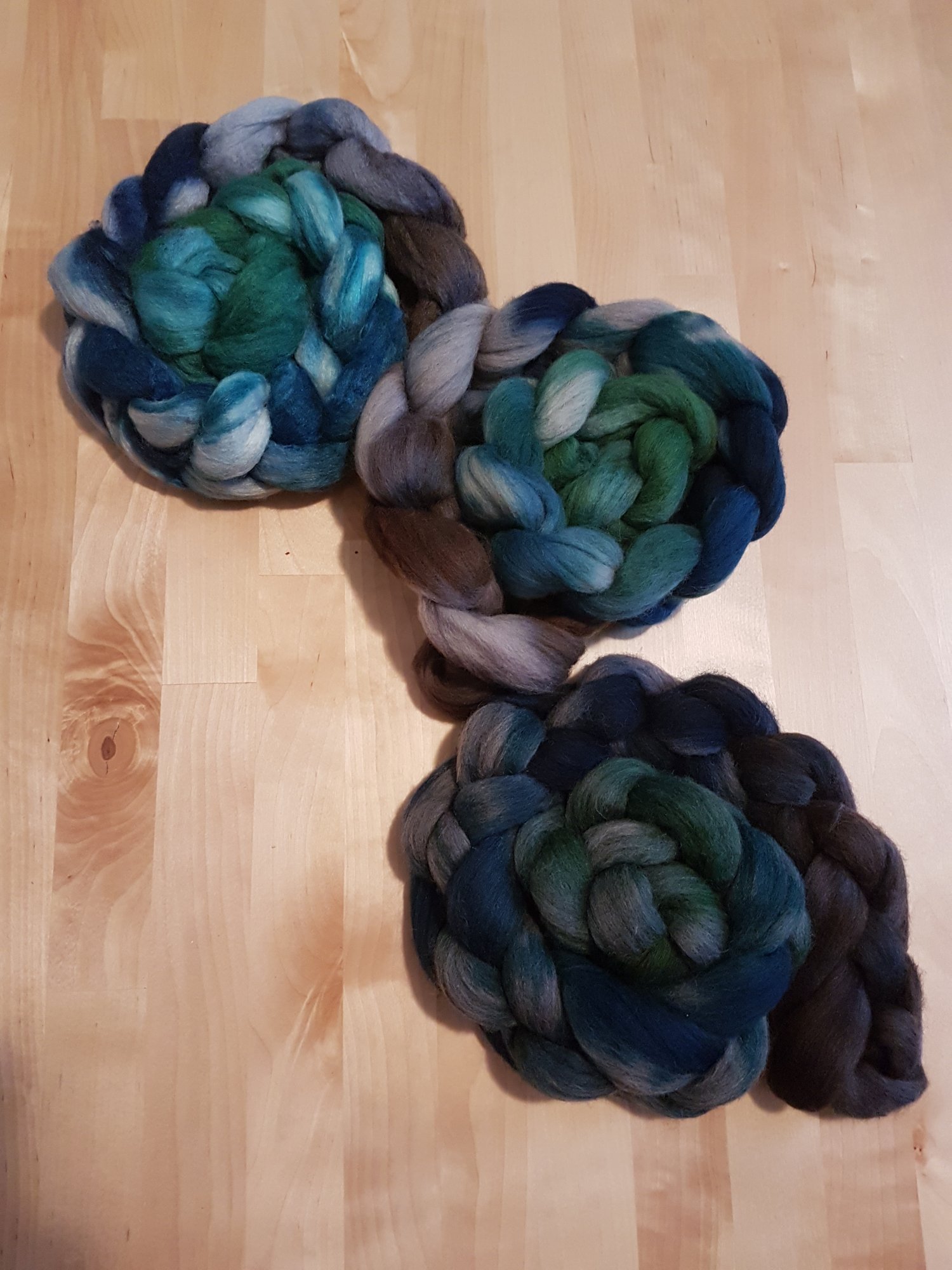 There are three different ropes of this roving, all done in the same dye batch, but with different fibre compositions.